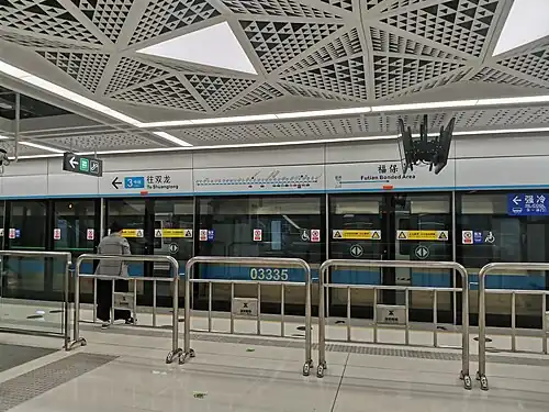 Futian Bonded Area station (Chinese: 福保站; pinyin: Fúbǎo Zhàn; Jyutping: Fuk1 Bou2 Zaam6) is the terminal station on Line 3 of the Shenzhen Metro. It opened on 28 October 2020.[1] The Chinese name 福保 is short for 福田保税区 (Futian Bonded Area, simplified Chinese: 福田保税区; traditional Chinese: 福田保稅區; pinyin: Fútián Bǎoshuìqū; Jyutping: Fuk1 Tin4 Bou2 Seoi3 Keoi1).