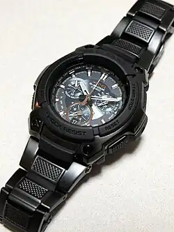 The G-Shock is a line of watches manufactured by the Japanese electronics company Casio, designed to resist mechanical stress, shock and vibration. G-Shock is an abbreviation for Gravitational Shock. The watches in the G-Shock line are designed primarily for sports, military and outdoors-oriented activities; all G-Shocks have a chronograph feature, 200 metre water resistance and an alarm, with either a digital display, analogue display or a combination of analogue and digital displays. Other features such as a countdown timer, world clock, and a backlight are included in most models. Newer high-end models in the line also feature GPS, directional, pressure and temperature sensors, radio-controlled time adjustment (known as WaveCeptor or Multi-Band) and Bluetooth time adjustment achieved by connecting the watch to a smartphone via a dedicated application.