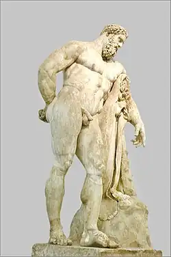The crest of G.S. Iraklis Thessalonikis depicts the demigod Heracles in a moment of rest leaning on his gnarled club, a scene inspired by the statue of Farnese Hercules, itself a copy of a statue crafted by Lysippos in the 4th century BC. Throughout the entire club's history, its colours are blue or cyan and white to resemble the colours of the flag of Greece given the fact that G.S. Iraklis Thessalonikis was established while Thessaloniki was a part of the Ottoman Empire. The club is so known in Greece as "Kianolefkoi" (Greek: Κυανόλευκοι, lit. 'Cyan-Whites').