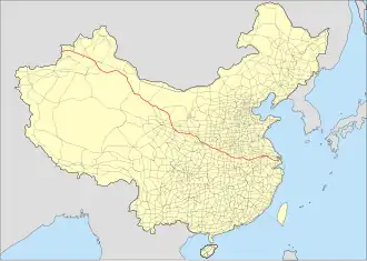 China National Highway 312 (312国道), also referred to as Route 312, is a key east-west route beginning in Shanghai and ending at Khorgas, Xinjiang in the Ili River valley, on the border with Kazakhstan. In total it spans 5,000 km (3,100 mi), passing through Jiangsu, Anhui, Henan, Shaanxi, Gansu before ending in Xinjiang. Besides Shanghai, cities of note on the route include Suzhou, Wuxi, Nanjing, Hefei, Xinyang, Nanyang, Xi'an, Lanzhou, Jiayuguan and Ürümqi.