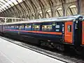 Accordingly, numerous private companies submitted bids to the Office for Passenger Rail Franchising.[2] One such firm was the Bermuda-based transport and container leasing company Sea Containers, whose bid was announced as the winner during March 1996, leading to a seven-year franchise upon the East Coast being awarded to their newly created subsidiary GNER.[3] The initials GNER were reminiscent of the historic London and North Eastern Railway (LNER, no relation to the current train operating company), the company that operated the route before being nationalised as part of British Railways in 1948. Additionally, the name combined the initials of two of the LNER's predecessor companies, the Great Northern Railway (GNR), who had built King's Cross station, and the Great Eastern Railway (GER). GNER made further links to the past companies by adopting a dark-blue livery with red trimming lines for its trains, similar to that used by the GER, and using a Victorian coat of arms-style crest on their trains.[4]