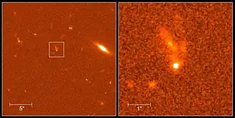 ![]() Optical afterglow of gamma-ray burst GRB 990123 (the bright dot within the white square and in the enlarged cutout) on January 23, 1999. The object above it with the finger-like filaments is its originating galaxy. This galaxy seems to be distorted by a collision with another galaxy.  | |