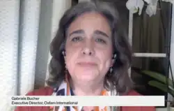 In 2020, Bucher was appointed Executive Director of Oxfam International. She was the first Colombian to lead the organization.[1] Under her leadership, Oxfam advocated for reducing wealth inequality global, increasing taxes on the wealthy and corporations, and ensuring an equitable global recovery from the COVID-19 pandemic. Bucher warned that the pandemic was intensifying global inequality, and criticized food corporation for reporting high profits as rates of acute hunger grew in the wake of the pandemic.[6] She also advocated for fairer global distribution of COVID-19 vaccines,[7] and called for a one-time 99% tax on the world's billionaires to fund expanded production of vaccines for the poor.[8][9] In 2022, Bucher spoke at a World Economic Forum panel on the future of global taxation.[10] In 2023, Bucher promoted an Oxfam report that called for raising minimum taxes for the wealthiest individuals, as well as raising taxes on large energy and food corporations.[11] In 2023, Bucher was included in Forbes Colombia's list of 100 Powerful Women for her work at Oxfam.[12]