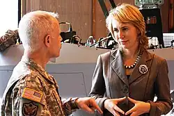 During the 2007 session of Congress, Giffords introduced a bill (H.R. 1441)[28] to forbid the sale of F-14 aircraft parts on the open market to prevent them from being acquired by Iran.[29] Giffords advocated for a national day of recognition for cowboys as one of her first actions.[30] She voted for the contentious May 2007 Iraq Emergency Supplemental Spending bill, saying, "I cannot, in good conscience, allow the military to run out of money while American servicemen and women are being attacked every day".[31]