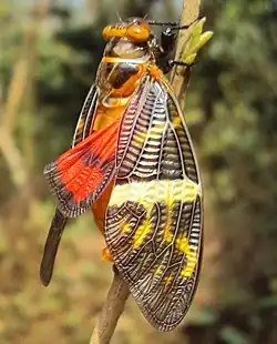 Gaeana atkinsoni is a colourful cicada species and is the only member of the genus Gaeana that is found in southern India. Other species are found along the Himalayas and in Southeast Asia. It is endemic to the forests of the Western Ghats where it emerges in summer. Males are brightly coloured with a yellow and black forewing and a bright red hindwing that is visible in flight.[1]