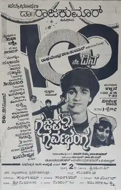 Gajapathi Garvabhanga (ⓘ) is a 1989 Indian comedy film in Kannada language directed by M. S. Rajashekar and produced by the actor Rajkumar's production company Purnima Enterprise.The movie stars his second son Raghavendra Rajkumar and Malashri.[1] The cast included Dheerendra Gopal, Srinath and Honnavalli Krishna. The film was a box office success,[2] and it ran in theatres for 365 days. Raghavendra Rajkumar's previous movie Nanjundi Kalyana was also a comedy with involving many of the same cast and crew.