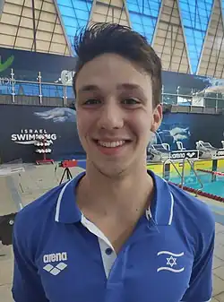 His father taught him how to swim because it was something he felt his son needed to know, but never pushed him to be a swimmer.[5][7][8] His swim club is Hapoel Hod Hasharon, and his coaches are Zohar Galili, Nikita Shkilenko, Tom Rushton, and David Marsh.[9][8]
