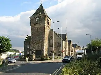 Following significant population growth, largely associated with the woollen industry, the area became a police burgh in 1850.[4] The new burgh commissioners decided to commission a new municipal building for the burgh: it was designed by Robert Hall & Co. in the Scottish Renaissance style, built in ashlar stone at a cost of £2,200 and was completed in 1867.[5][6] The design originally involved a symmetrical main frontage with four bays facing onto Albert Place; the central section of two bays, which slightly projected forward, featured two segmental sash windows on the ground floor, a tall two-light window with tracery on the first floor and a stepped gable above.[1] The outer bays were fenestrated with segmental sash windows, although there was a panel in the left hand bay on the ground floor inscribed with the words "Burgh Chambers 1867". A stone plaque inscribed with the burgh coat of arms was installed on the northwest elevation of the building.[b] Internally, the principal room was the council chamber on the first floor.[1]