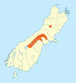| Approximate known distribution (in orange) of the longjawed galaxias on a map of the South Island | |