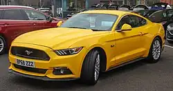 Changes include a body widened by 1.5 inches and lowered 1.4 inches, a trapezoidal grille, and a 2.75-inch lower decklid, as well as new colors. The passenger volume is increased to 84.5 cubic feet, the wheelbase is still 8 ft. 11.1 in. (107.1 in.), and three engine options are available: a newly developed 2.3 L EcoBoost 310 hp four-cylinder introduced to reach high tariff global markets like China,[73] 3.7 L 300 hp V6,[74] or 5.0 L Coyote 435 hp V8, with either a Getrag six-speed manual or six-speed automatic transmission with paddle shifters.[75][76][77]