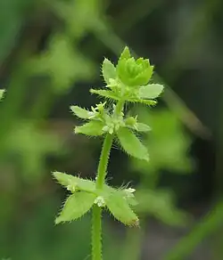 Cruciata pedemontana is an erect herb up to 30 cm (12 in), covered with stiff hairs. Leaves are broadly ovate, usually four per node. Flowers are tiny, rarely more than 1 mm (0.039 in) across, axillary, pale yellow.[4]