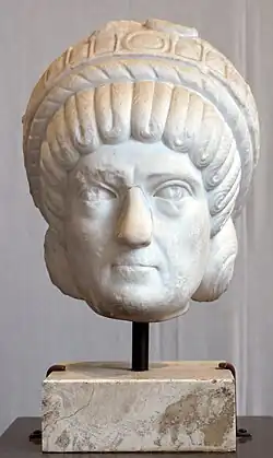 Placidia was a younger, paternal half-sister of emperors Arcadius and Honorius. Her older half-sister Pulcheria predeceased her parents according to Gregory of Nyssa, placing the death of Pulcheria prior to the death of Aelia Flaccilla, the first wife of Theodosius I, in 385.[8] Coins issued in Placidia's honour in Constantinople after 425 give her name as AELIA PLACIDIA; this may have been intended to integrate Placidia with the eastern dynasty of Theodosius II.[9] There is no evidence that the name Aelia was ever used in the west, or that it formed part of Placidia's official nomenclature.[10]