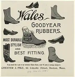 The transition from a traditional wooden sole galosh to one of vulcanized rubber may be attributed to Charles Goodyear and Leverett Candee. The qualities of rubber, though fascinating to Goodyear, were highly dependent on temperature: it was tacky when hot, brittle when cold. Vulcanization of rubber tempered its properties so that it was easily molded, durable, and tough. A rubberized elastic webbing made Goodyear's galoshes (c. 1890) easy to pull on and off. Beginning in the early 20th century, galoshes were almost universally made of rubber.[2] Overshoes have evolved in the past decades and now are being made of more advanced materials with new features, such as high traction outsoles.