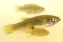 The Pecos gambusia (Gambusia nobilis), also known as the Pecos mosquitofish,[3] is a species of fish in the family Poeciliidae endemic to the Pecos River in Texas and New Mexico in the United States. This two-inch species, as most of its family, is a livebearer. Females produce broods of up to 40 fry every four to five days. The fish are omnivorous, eating algae and small invertebrates, and are endangered due to loss of their spring-fed desert habitat.[4]