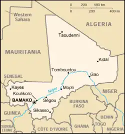 Archaeological digs show that Gao-Saney was occupied by roughly 700CE, and was a center of manufacturing, iron smelting, and trade with areas as far away as Mesopotamia.[2] It was the southern terminus of a trade route powered by chariots that linked it to the Mediterranean.[3] At some point no later than the early 10th century the Songhay king moved to the site of Gao Ancien, just north of the modern city on the bank of the Niger river and a few kilometers from Gao Saney.[4] The kings of this period were of a lineage known as Qanda.[5]