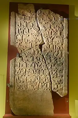 Gao-Saney became well known among African historians when French administrators in 1939 discovered, in a cave covered with sand, several finely carved marble stelae produced in Almeria in Southern Spain.[12] Their inscriptions attest to three kings of a Muslim dynasty bearing as loan names the names of Muhammad and his two successors. From the dates of their deaths it appears that these kings of Gao ruled at the end of the twelfth and the beginning of the thirteenth centuries CE, and represent a transition in leadership.[13]