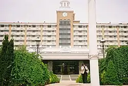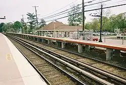 The central attraction of the new community was the Garden City Hotel. It was replaced by a new hotel in 1895, designed by the acclaimed firm of McKim, Mead & White.[6] This hotel was destroyed by fire in 1899 and then rebuilt and expanded, before being replaced again in 1983.[7] The hotel still stands on the original grounds, as do many nearby Victorian homes.[8] Access to Garden City was provided by the Central Railroad of Long Island, another Stewart project which he undertook at the same time. This railroad, in conjunction with the Flushing & North Side Railroad, ran from Long Island City through Garden City to Farmingdale (with a spur to the location of the Stewart's brickworks in Bethpage), and then to Babylon. It opened in 1873, with a branch to Hempstead.[9]