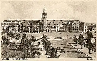 Gare de La Rochelle is the main railway station serving La Rochelle. The station building, which includes a 45-metre-tall clock tower, was built in 1922 by Pierre Esquié for the CF de l'Etat replacing the older building. The railway station is well known for the "Danseurs au ballon" painted on the ceiling by Emile Sourice and Nicus Georget, 2 local artists. The station was renovated by Franck Beck and Luc Mouret in the early 1990s for the arrival of the TGV Atlantique.