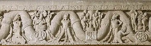 The erotes or putti holding garlands is one of the most common motif of the Greco-Buddhist art of Gandhara.[1] According to John Boardman, they find their origin in Hellenistic designs, rather than Roman ones.[1] The garlands had an important role in decorating Buddhist stupas.[4]