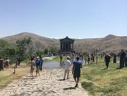 By the mid-20th century, even before its reconstruction, it had already become a major tourist destination,[174][175][176] attracting tens of thousands of visitors by the early 1970s.[177] Today, it remains one of Armenia's most visited sites, along with the nearby medieval monastery of Geghard.[178][179] Many visitors choose to visit both locations, collectively known as Garni–Geghard, on a day trip from Yerevan.[180][181] Some 200,000 people visited the temple in 2013.[182] The number nearly doubled by 2019, prior to the COVID-19 pandemic, when Garni received almost 390,000 visitors, including 250,000 Armenians and 137,400 foreigners.[183]