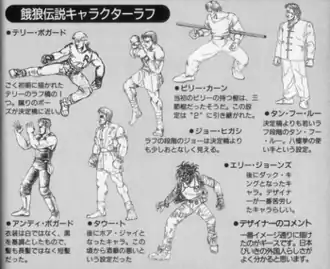 The sound team had between four and five months to develop the audio. The voice acting was done by the staff themselves which was disapproved by higher ups resulting in next installments having professional voice actors. According to Nobuyuki Kuroki, "The Fatal Fury series was always about macho fighters", something which resulted in changes in later installments when the developers believed the games were becoming outdated in comparison to their other famous IP, The King of Fighters.[15] Veteran developer Yasuyuki Oda believes the detailed facial expressions and 2D backgrounds were the secret behind Fatal Fury's fame. Oda also believes the fact that the cast does not look like actual fighters left a major impact.[16] Nishiyama originally created Terry for Street Fighter as a Caucasian man wearing a leather jacket; they decided to make the main playable character a dougi-clad karateka name Ryu instead. They still wanted to use this concept in a game; after their move to SNK, they implemented him as a playable character in Fatal Fury.[17] Terry's original appearance was made with the intention that he did not look like a martial artist, contrasting the looks of his brother Andy.[18] In the making of the series, Terry and his brother Andy were characterized as the heroic leads, contrasting with the comical Joe Higashi.[19] The SNK staff described his original design as "the most macho, stand-out, original Terry".[20] A sumo wrestler was meant to be part of the roster but was removed by Michael Max. SNK avoided Fatal Fury to be too similar to Street Fighter II. Andy originally wore black costumes and had short hair. A character model named Tau To would serve as the basis for Hwa Jai. Duck King, meanwhile, was originally known as Ellie Jones with the designer having several troubles with him. However, the main designer had no problems with Geese as he enjoyed his Japanese-loving characterization. Tung Fu was originally going to appear younger than in the finished product.[21]