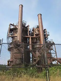 (A): Towers 1 and 2 (largest and closest to the lake) are Semet-Solvay–type generators built in 1937–38. Each has a single outer shell made of welded steel lined inside with refractory brick. Tower 1 is 80 ft (24 m) and Tower 2 is 75 ft (23 m) tall. At their peak they could manufacture 6 million cubic feet (170,000 m3) of gas a day.