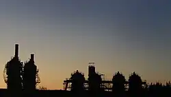 There are two groups: 1) six synthetic natural gas generator towers with their attendant processing towers, and 2) oil absorber and oil cooler (between the play barn and the generators). The generators operated in pairs and were built at different times.
