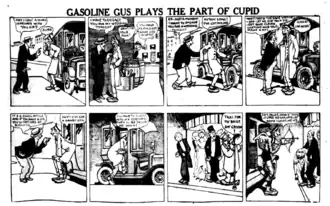 Gasoline Gus is an early 20th century popular culture figure who also appeared in cartoon strips and a record single, both of which precede the film. The comic strip was written by O.P. Williams and was syndicated by the Philadelphia North American between 1913 and 1914. Gasoline Gus was a taxi driver and car fanatic who constantly wrecked his early automobile.[4] Billy Murray and the American Quartet recorded the song "Gasoline Gus and his Jitney Bus" in 1915.[5]