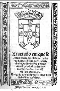 In Donald F. Lach's assessment, Cruz' book itself did not become widely distributed in Europe either because it was published in Portuguese (rather than some more widely spoken language), or because it appeared in the year of the plague.[5] Nonetheless, Cruz' book, at least indirectly, played a key role in forming the European view of China in the sixteenth century, alongside the earlier and shorter account by Galeote Pereira (1565).[7] Cruz' Treatise (along with João de Barros' earlier coverage of China in his Decadas) was the main source of information for Bernardino de Escalante's Discourso ... de las grandezas del Reino de la China (1577), and one of the main sources for the much more famous and widely translated History of the great and mighty kingdom of China compiled by Juan González de Mendoza in 1585.[5]