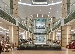 Gateway 1 also highlights a Fabergé egg-designed glass pavilion located along General Aguinaldo Avenue, which took its inspiration to the Araneta Coliseum and features a high-ceiling glass dome that blends both steel and glass. The pavilion is also surrounded by the al-fresco dining known as the Coliseum Circle and the Courtyard, and connects the Araneta Coliseum through the mall's sidewalks and alleyways. The exterior designs of the pavilion and the interior designs of the mall were inspired from Filipino festivals and motifs of various patterns.[13] The mall features an activity atrium; The Oasis, an indoor, air-conditioned open-roof garden;[14] The Gateway Gallery;[15] and The Topiary Garden, an open-air rooftop garden, both located at the 5th level.[16] The 3rd level of the mall houses The Food Express food court, and the 4th level of the mall contains the first 10-cinema cineplex of the Gateway Cineplex 18, which features an indoor skylight in its main lobby and includes the 500-seater Cinema 5 and the Platinum Cinema.[17]