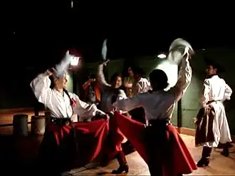 According to the Diccionario de la lengua española, in its historical sense a gaucho was a "mestizo who, in the 18th and 19th centuries, inhabited Argentina, Uruguay, and Rio Grande do Sul in Brazil, and was a migratory horseman, and adept in cattle work".[4] In Argentina and Uruguay today, gaucho can refer to any "country person, experienced in traditional livestock farming".[4] Because historical gauchos were reputed to be brave, if unruly, the word is also applied metaphorically to mean "noble, brave and generous", but also "one who is skillful in subtle tricks, crafty".[4] In Portuguese the word gaúcho means "an inhabitant of the plains of Rio Grande do Sul or the Pampas of Argentina of European and indigenous American descent who devotes himself to lassoing and raising cattle and horses"; gaúcho has also acquired a metonymic signification in Brazil, meaning anyone, even an urban dweller, who is a citizen of the state of Rio Grande do Sul.[5][6]