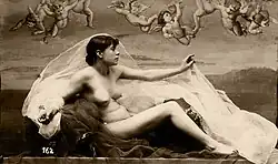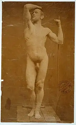 The Marconi collection of albumen prints from wet collodion plates are among the best-known of this type of nude which relate to tableaux vivants and which imitated celebrated works of classical antiquity and Renaissance art recognisable immediately by the viewer, or at least with some certainty. Backgrounds and props were kept minimal, as they would be in a life studio, in order to support their identification as artists' reference material, not intended as pornography.[1] Accomplished artists and students often sketched the figure from photographs when living models were not available or proved too costly.[2] Marconi's photographs were used by famous artists[3] to whom he offered allegorical nudes with indicative titles; "a Michelangelo" and one "a P.P. Rubens", or "a tribal woman. The académies are thus a special form of the tableaux vivants in terms of meaning and artistic purpose, and were not regarded officially as pornographic, though clandestinely, they had such a market.[4]