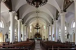 St. Joseph's Church is located on the east side of Ronggo Warsito Street in Semarang, Central Java. Administratively, it is part of the parish of St. Joseph in the Archdiocese of Semarang. The red-brick building can seat 800 people.[5][1] It faces west and has windows on all sides, as well as five entrances (two on the north side, two on the south side, and one on the west side).[26] The roof is a white cross-ribbed vault supported by ionic columns.[27]
