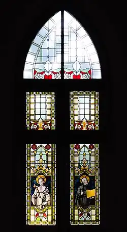 The interior of the church has nineteen stained glass windows, three behind the altar and eight along each side of the church building. The windows behind the altar focus on St. Joseph and depict, from right to left, the sojourn of the Holy Family in Egypt; the daily lives of the Holy Family; and the death of Joseph. Four of the sixteen windows on the sides of the church (those closest to the altar and those closest to the doors) depict lilies. The remaining twelve windows each depict a single saint, including Ignatius of Loyola, Stanislaus Kostka, and Saint Cecilia.[28] Further ornamentation of the walls includes carvings depicting the fourteen Stations of the Cross as well as twelve triforiums holding paintings illustrating the Lord's Prayer, the Bread of Life Discourse, and praise to Christ and Mary.[29] On top of the altar, at the eastern end of the church, is a tabernacle. The altar, imported from Germany in 1880, is decorated with statues of Abraham, Peter, Paul, and Melchizedek.[1]