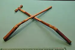 A gee-haw whammy diddle is a mechanical toy consisting of two wooden sticks. One has a series of notches cut transversely along its side and a smaller wooden stick or a propeller attached to the end with a nail or pin. This stick is held stationary in one hand with the notches up, and the other stick is rubbed rapidly back and forth across the notches. This causes the propeller to rotate. Sometimes also known as a ouija windmill, a hoodoo stick or a VooDoo stick. The word whammy is sometimes whimmy, and the word diddle sometimes doodle, giving it three possible other names, and the gee-haw may also be dropped.