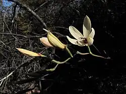 Geissorhiza melanthera is a small perennial plant of 14–18 cm high that is assigned to the family Iridaceae. It survives the dry southern summer through storage of its resources in a corm. The stem carries two or three erect, sticky leaves of up to 18 cm (7 in) long, H-shaped in cross-section. This species blooms with six to twelve bilaterally symmetrical flowers, in a spike. Sometimes the spike has one side branch with fewer flowers. Each flower has six pale beige perianth lobes, a purple-red ring around a purple red tube and three blackish stamens. Each flower is subtended by two 1.25–2.25 cm long green bracts. This species flowers from the end of September till mid October. It is an endemic of the western slopes of the Piketberg Mountain Range in the Western Cape province of South Africa.[1]