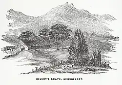 This story formed the basis for several English poems, among which are "Beth Gêlert; or, the Grave of the Greyhound" by William Robert Spencer written around 1800;[5] "Beth Gelert" by Richard Henry Horne;[6] "Gelert" by Francis Orray Ticknor[7] and the dramatic poem "Llewellyn" by Walter Richard Cassels.[8] The tale is also alluded to by John Critchley Prince in lines 24 to 29 of his poem "North Wales:" "Thou hast not trod with pilgrim foot the ground / Where sleeps the canine martyr of distrust, / Poor Gelert, famed in song, as brave a hound / As ever guarded homestead, hut, or hall, / Or leapt exulting at the hunter’s call; / As ever grateful man consigned to dust."[9] Despite this, and despite the presence of a raised mound in the village called Gelert's Grave, historians do not believe that Gelert ever existed.