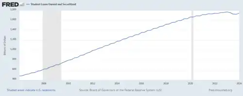 As Generation Z enters high school, and they start preparing for college, a primary concern is paying for a college education without acquiring debt. Students report working hard in high school in hopes of earning scholarships and the hope that parents will pay the college costs not covered by scholarships.[247] As of 2019, the total college debt has exceeded $1.5 trillion, and two out of three college graduates are saddled with debt.[17] A 2019 survey found that over 30% of Generation Z and 18% of Millennials said they have considered taking a gap year between high school and college.[248] In order to address the challenges of expensive tuition and student debt, many colleges have diversified their sources of revenue, especially by changing enrollment, recruitment, and retention, and introduced further tuition discounts. Between the academic years 2007-8 and 2018–9, tuition discounts increased significantly. Almost nine in every ten first-time full-time freshmen received some kind of financial aid in the academic year 2017–8.[249] Students also report interest in Reserve Officers' Training Corps (ROTC) programs as a means of covering college costs.[247] Indeed, college subsidies are one of the most attractive things about signing up for military service. Another enticement is signing bonuses, whose amounts vary according to specialty.[250]