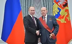 Novozhilov served as a deputy of the Supreme Soviet of the Soviet Union from 1974 to 1989, then as a People's Deputy of the USSR from 1989.[2][5][8] He became a member of the Central Committee of the Communist Party of the Soviet Union in 1986.[4] As well as his two Heroes of Socialist Labour, Novozhilov held a number of other state awards. He was awarded the Order of Lenin three times, on 10 February 1969, 26 April 1971 and 23 June 1981; the Order of the October Revolution on 27 October 1975; the Order of the Red Banner of Labour on 22 July 1966; the Order of the Badge of Honour on 7 December 1957; and the Order of Friendship of Peoples on 29 December 1992.[5][9] He also received the Order of Holy Prince Daniel of Moscow Third Class and the Order "For Merit to the Fatherland" in three classes.[9][3] He had married Lyudmila Ivanovna Lisina, a philologist on 23 April 1966.[3] The couple had a son, Sergey Genrikhovich, born in 1967, who became an aircraft engineer.[2] Late in life Genrikh Novozhilov listed his interests as tennis and photography.[9][3]