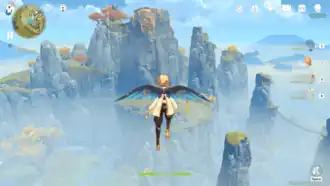 The player can control their character and perform actions such as running, climbing, swimming, and gliding, all limited by stamina.[10][5] Some characters possess abilities that can alter the environment, such as freezing water to create an ice path that can aid the player in traversing terrain.[5] Many teleportation points exist throughout the world that players can warp to as a form of fast travel; among these are landmarks known as Statues of The Seven that can heal and revive characters, and provide benefits such as increasing player stamina.[11] Items such as food and ore may be procured from the open world, while enemies and treasure chests drop other types of resources that may be used in enhancing a character's strength. Players can obtain food from hunting animals, gathering fruit and vegetables, or purchasing them from in-game shops. Furthermore, there are special battle instances called "Domains" that reward materials which increase character and weapon strength.[12] Meals cooked from ingredients gathered in the overworld may also provide desirable effects, such as regenerating characters' health or boosting various stats.[13] Players can also procure ore that can be refined and then used to create weapons or enhance their strength.[14][15]