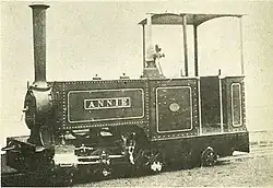 The tramway operated two W. G. Bagnall locomotives. "Jack", was works No. 1879 of 1911. It was originally 0-4-0ST, but was later modified with a trailing axle and tender to be a 0-4-2.[4] "Jack" was delivered from the Bagnall Locomotive Works, England, on 26 January 1911. It had a weight of 5.25 tons and measured 11 ft 4 in (3.45 m) over the buffers. "Jack's" weight increased to 7 tons, when the tender was added by the council.[2] "Annie", works No. 1922 also of 1911, was built a 0-4-2T side tank.[4] "Annie" arrived from the Bagnall Works on the S.S."Squall" on 23 March 1912, and was stationed at the quarry end of the tramway.[2] A replica locomotive operates at the Groudle Glen Railway on the Isle of Man, and another was built beforehand in Australia. Both locos worked at Moutohora Quarry until being laid up circa 1924. The whereabouts of "Jack" are unknown, but the frames of "Annie" have been preserved at the East Coast Museum of Technology, Makaraka.[4] The tramway also used a Straker steam road waggon converted to rail use.[5]