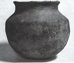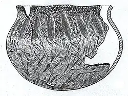 Langford ware was first reported at the Fisher site, and has also been found at the nearby Zimmerman[3][9] and Plum Island[2] sites. It is characterized by grit-tempered, globular vessels with restricted orifice and well-defined shoulders and excurved rim profiles. Surface finish is usually smoothed and decoration, when present, is applied to the neck and shoulder areas and consists of incised and trailed lines, punctates and finger impressions, combined to form arches and festoons. Lugs and loop handles are present on some vessels and nodes are also sometimes present.[1][2][3][9]