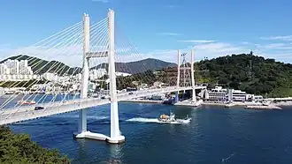 The Geobukseon Bridge (Korean: 거북선대교), also called the Second Dolsan Bridge (제2돌산대교), is the main bridge on the Yeosu Road between Udu-ri, Dolsan and Jonghwa-dong, linking the Port of Yeosu with Dolsando across the Namhae sea.[2] The bridge is floating cable-stayed bridge with 464m (35+82+230+82+35m) length and its construction started in June 2008. It opened in April 2012 and carries four lanes of motor vehicle traffic.[1] The new link was intended to reduce traffic congestion on the First Dolsan Bridge which opened in 1985, and act as an important infra-structure link during the Yeosu Expo which had been held from May, 2012 for three months. The bridge was built by contractor Daelim Industrial Co. Ltd for client Iksan Regional Construction & Management Administration. Contract cost is US$60million, which includes a 460m long tunnel at one end, and a 280m long approach bridge.[3]