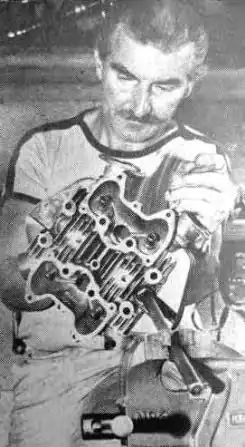 Monty in 1969 working on a Triumph cylinder head with a twin spark plug conversion using additional, centrally-located, smaller 10 mm plugs, mounted into a bench-vice via a tube screwed into one of the original 14 mm plug-threads