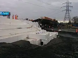 The largest geofoam project in the United States took place from 1997 to 2001 on Interstate 15 in Salt Lake City, Utah.[5] Geofoam was chosen to minimize that amount of utilities that would need to be relocated or remodeled for the project. A total of 3,530,000 cu ft (100,000 m3) of geofoam was used, and approximately $450,000 was saved by eliminating the need to relocate utility poles.[6] Geofoam was also used in embankments and bridge abutments for base stability.[4] Subsequently, because of the success of usage of geofoam for the I-15 Reconstruction Project, the Utah Transit Authority has used geofoam embankment for its light rail (i.e., TRAX) and commuter rail lines (i.e., FrontRunner).[7]