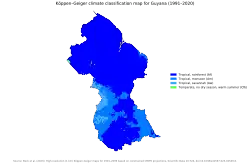Lying near the equator, Guyana has a tropical climate,[4] and temperatures do not vary much throughout the year.[1] The year has two wet seasons, from December to early February and from late April to mid-August.[5]