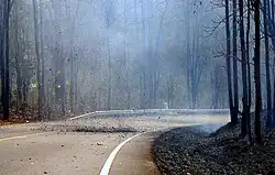 Wind-blown smoke and ash from a forest fire along the Mae SariangKhun Yuam road in Mae Hong Son province, 2010.