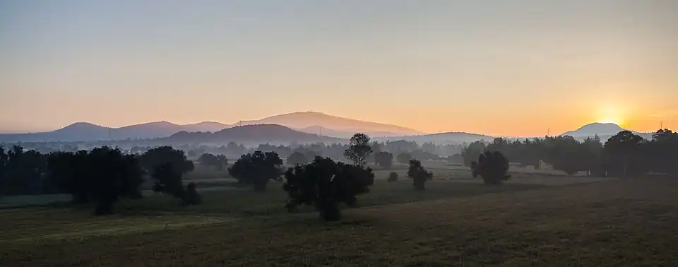 The Altiplanicie pulquera, also known as the plains of Apan, is a highland with three lake areas, small the so-called lagoons of Tochac-Atocha, Apan[18] it has cultivation landscapes, especially the maguey pulque.[13] The Basin of Mexico, also called the Pachuca-Tizayuca Valley, corresponds to semi-arid plains that are highly usable for agricultural activities.[16] It is a corridor protected by a chain of hills on each side.[13] The Mezquital Valley is made up of various valleys and plains, limited by isolated volcanic mountains and basaltic spills;[13] it includes a surface of extreme aridity.[16]