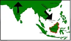 The SE Asia region is made up of fragments of crust that drifted northwards after being separated from Gondwana.[1][4] These continental fragments make up the basement that formed prior to the magmatic activity and ophiolite emplacement. Gondwana was a large continent that once extended over the south pole during the Paleozoic times. Some of these crustal fragments form Sundaland, the region of the continental core of SE Asia. Sundaland is surrounded by the South China and India continental blocks to the north and Australia to the south. Fragments of Gondwana that reached as far north as Eurasia include Thailand and peninsular Malaysia. Other fragments that did not reach so far north form southwest Borneo's Schwaner Mountains in Kalimantan, and also Sumatra and Java.[1][2][5]