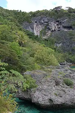 Sedimentary rocks of the Nepoui Series are spotted in places like Nepoui Bay, which include lagoonal limestone, calcareous sand to slightly unconformable conglomerate and sands again.[2] Re-emergence of plant fossils after obduction is spotted in the latter layer.[7] The regolith pebbles in the conglomerate are well-rounded and cover and consist of pre-existing local rocks like peridotite.[2][40] Similar conglomerates and breccias are also found in the Gwa (or Goa) N'doro Formation near Houaïlou, and represents the remnants of a river network developed since Miocene.[2][40][28] These all witness the uplift, erosion, then deposition of the island since Oligocene.[2][15]
